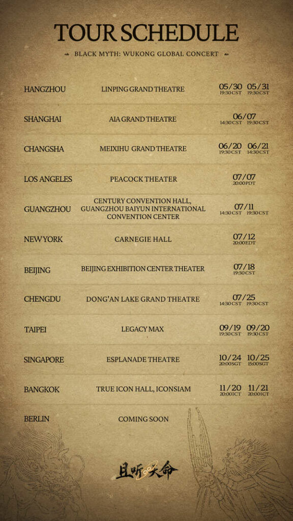 L’un des points forts de cette tournée mondiale est l’intégration de la musique folklorique traditionnelle chinoise avec une orchestration symphonique. En collaboration avec des musiciens expérimentés de différentes régions, Game Science offrira une expérience musicale immersive mêlant Orient et Occident à tous les Élus du Destin.