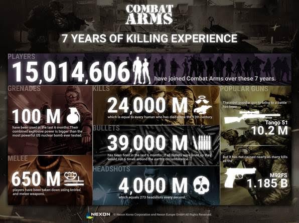 Nexon dévoile également aujourd’hui de nombreux chiffres et faits impressionnants au sujet des farouches parties de ces sept dernières années dans Combat Arms. Cette commémoration d’anniversaire est une très bonne occasion pour revenir sur les faits marquants réalisés par une communauté totalement dédiée. Les détails de l’impressionnante histoire de Combat Arms longue de 7 ans peuvent être découverts dans l’infographie suivante :