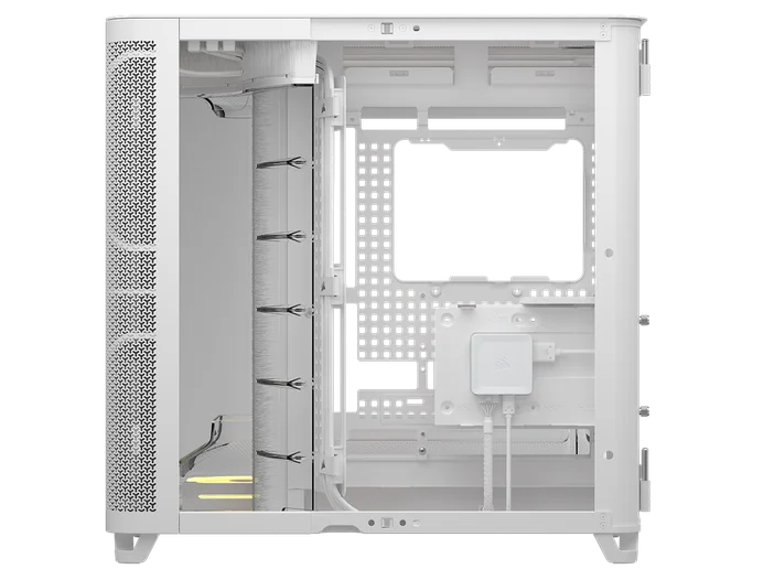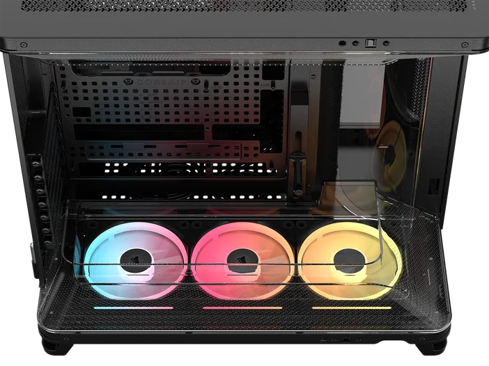 Le CORSAIR AIR 5400 est notre premier boîtier à trois compartiments. Il dispose d’une zone dédiée au refroidissement du processeur, d’un compartiment central avec un conduit d’air pour concentrer le flux d’air vers le processeur graphique et la carte mère, et d’un troisième compartiment pour isoler et refroidir le stockage de masse et l’alimentation électrique des autres zones.
