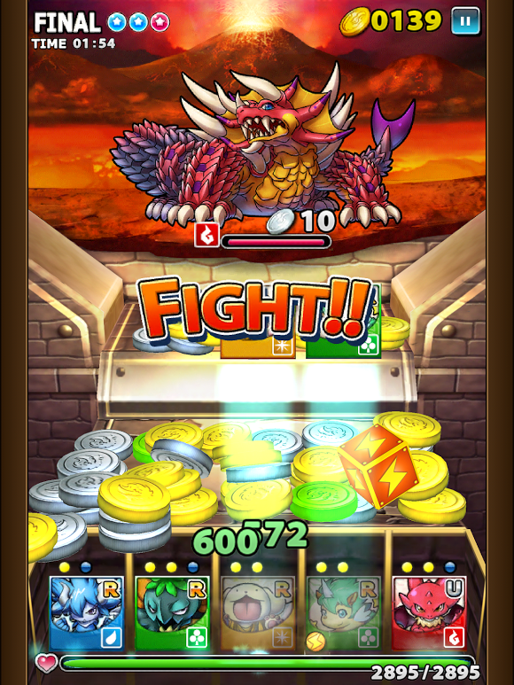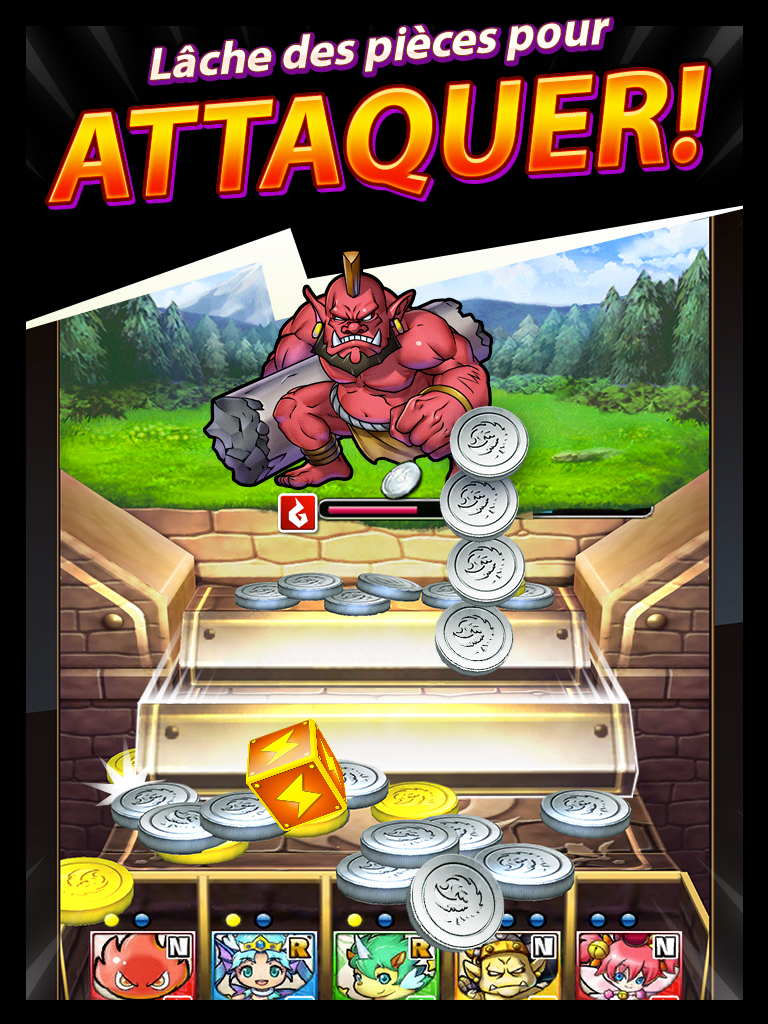 Dans Dragon Coins, les joueurs devront placer des pièces de manière stratégique sur la plateforme mouvante d’un pousse-pièces afin de les faire chuter aux bons endroits. Vos monstres ont en effet besoin de pièces pour charger leurs attaques et ainsi affaiblir l’ennemi qui vous fait face. A l’aide d’un positionnement habile et synchronisé, la chute des pièces permettra de déclencher des combos dévastateurs.