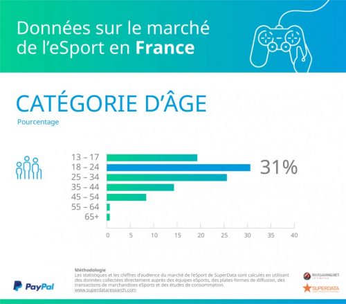 Selon l’étude SuperData, la génération des millennials est actuellement celle qui consomme le plus d’e-sport. Sur l’ensemble du marché européen, seulement 10% des fans d’e-sport ont plus de 45 ans, l’industrie du jeu numérique est d’ailleurs presque entièrement détenue par les millennials : les deux groupes d’âge les plus intéressés par l’e-sport sont les générations 18-24 ans et 25-34 ans (ces groupes occupent ensemble 62% du public).