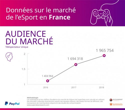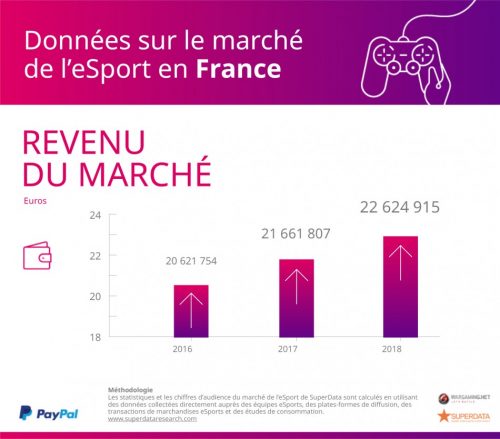 Depuis 2016, on constate que la France se classe en bonne position sur le marché du e-sport, avec des recettes en constante évolution : 22,4 millions de dollars en 2016, 23,5 millions de dollars en 2017 et ce montant devrait atteindre 24,7 millions de dollars en 2018 ; ces résultats encourageants font donc de l’hexagone un des principaux acteurs de ce marché.