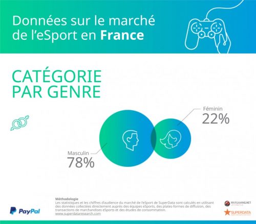 Le profil des spectateurs d’e-sport est majoritairement représenté par le genre masculin. En Europe, il attire 84% des spectateurs contre 16% de spectatrices ; la Suède, la France, le Royaume-Uni et la Pologne sont les pays où la part d’audience du genre féminin est la plus forte, respectivement 24%, 22%, 22% et 19%. Le taux le plus faible se trouve en Israël où les femmes représentent 10% des spectatrices.