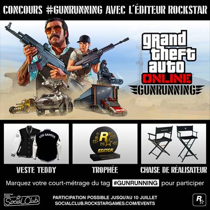 - être publiée sur le Rockstar Games Social Club et être marquée du tag #GUNRUNNING avant le mardi 11 juillet à 5 h 59 du matin, heure française (le 10 juillet à 23 h 59 ET). « ET » se réfère à l’heure locale de la ville de New York aux États-Unis ;