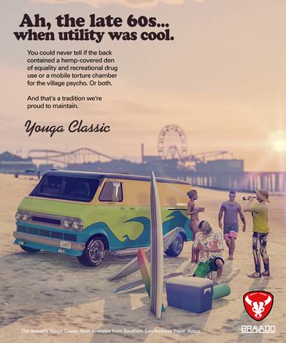 Le Bravado Youga classique, le summum de l’authenticité et de la contre-culture, est désormais disponible chez Southern San Andreas Super Autos. Vu la hauteur des suspensions de ce véhicule utilitaire idéal pour aller à la plage, les promeneurs vont se demander ce que vous pouvez bien fabriquer à l’arrière. Mais ils en auront certainement une petite idée…