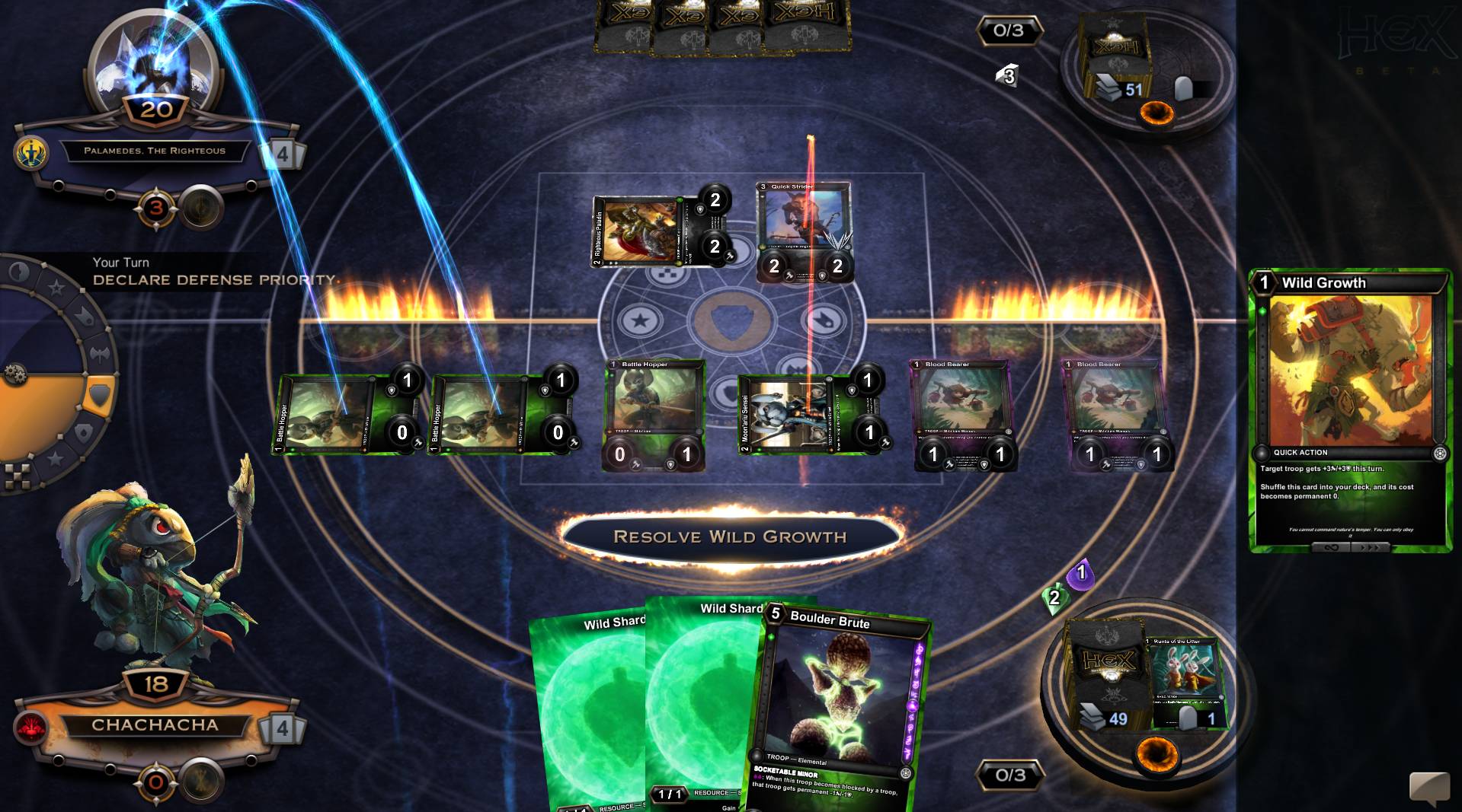 Préalablement à cette ouverture, un dernier patch vient introduire de nombreuses améliorations et fonctions de convivialité. Outre l’interface retravaillée, qui permet une meilleure lisibilité en cours de duels, un tutoriel approfondi est introduit afin de permettre aux débutants de se familiariser avec les mécaniques d’HEX: Shards of Fate. En plus des joutes passionnantes disputées face à d’autres joueurs, la bêta publique propose des duels variés contre des IA adverses de différents niveaux.