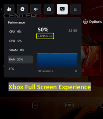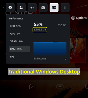 - Réduction de l’utilisation de la mémoire système : le Xbox Full Screen Experience réduit la consommation de mémoire système de plus de 5 % par rapport aux PC de bureau standards, ce qui libère plus de mémoire pour les jeux et résulte en un gameplay plus fluide et potentiellement un niveau de fps plus élevé.