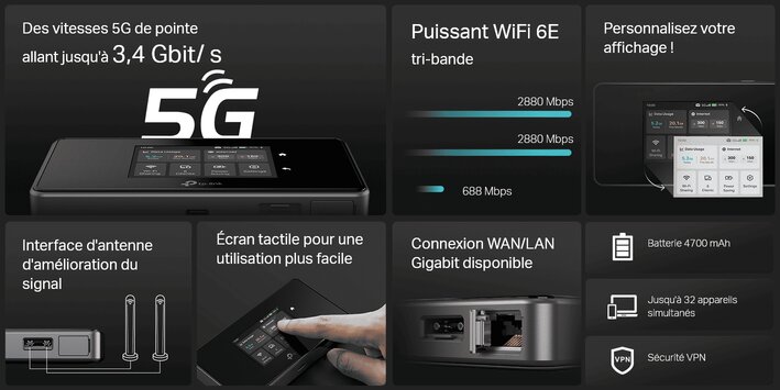 Pensé pour la mobilité avec son format compact et sa batterie longue durée offrant 14h d’autonomie, ce Mifi 5G s’adapte à de nombreux scénarios d’utilisation. Il constitue une solution idéale pour les voyageurs et les télétravailleurs souhaitant rester connectés en déplacement, mais aussi une alternative fiable aux zones mal desservies par les lignes fixes ou une connexion de secours en cas de panne internet. Il est doté d’un port Gigabit WAN/LAN pour vos appareils filaires et supporte une compatibilité complète VPN pour les besoins professionnels.