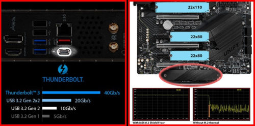 Conçues pour les joueurs exigeants de hautes performances, les cartes MSI MEG 490 UNIFY offrent des débits très élevés grâce au port LAN 2,5Gigabit et à la solution Wi-Fi 6 AX, permettant des connexions filaires et non filaires à la pointe. Exclusif à la MEG Z490I UNIFY, le port Thunderbolt 3 représente la solution la plus rapide et polyvalente pour se connecter à une station d’accueil, un écran ou un périphérique de stockage et atteindre des vitesses de transfert de données jusqu’à 40 Gb/s. Les trois slots Turbo M.2 de la version ATX permettent quant à eux des vitesses de transfert jusqu’à 32 Gb/s avec les derniers SSD du marché. La Z490 UNIFY se dévoile également avec deux dissipateurs Shield Frozr afin de prévenir la chauffe et le throttling des SSD M.2, les rendant plus rapides et stables pendant les longs transferts de données.