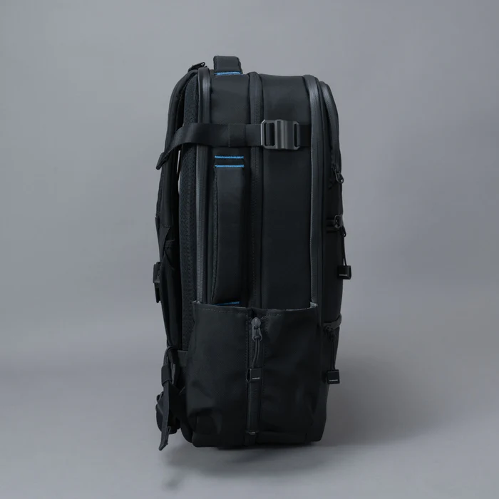 Visuellement, le Travel Backpack affiche une sobriété assumée, presque militaire. Le choix du nylon balistique 840D en partie supérieure et de la bâche en base crée un contraste de textures qui exprime la solidité fonctionnelle. Ces matériaux, reconnus pour leur résistance à l’abrasion et à l’eau, confèrent au sac une résilience concrète. Après de longues expositions à l’humidité, des projections salines ou des accrochages urbains, aucune déformation ni blanchiment ne s’est manifesté. La tenue des surfaces, y compris les bords sensibles, témoigne d’une conception sans compromis. Les fermetures YKK, précisément scellées et traitées contre les infiltrations, se manient avec un glissement d’une finesse quasi horlogère. Aucun blocage, aucune rigidité, même après des mois de contraintes répétées. L’accastillage en aluminium anodisé noir, du plus petit anneau aux attaches latérales, renforce l’impression de solidité ingénieuse. Les poignées épaisses, rembourrées, solidement ancrées dans l’armature, autorisent un portage latéral ou vertical sans torsion. Le dos et les bretelles, structurés autour de mousses segmentées respirantes, gèrent efficacement la dissipation thermique. Même porté plusieurs heures en été sur un tarmac ou dans une rame bondée, le sac reste supportable. Cumulé à son poids de 1,5 kg à vide, il compose une ergonomie optimisée. Le zip périphérique permet un passage fluide de 25L à 30,5L, sans rupture visuelle ni affaissement structurel. Le sac s’étire sans se déformer, préservant un centre de gravité stable.