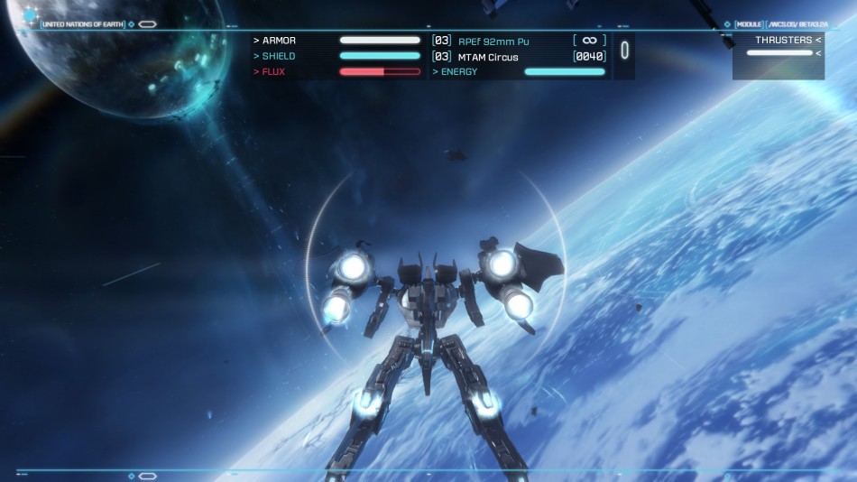 Mais notre héros remplacera rapidement son vaisseau « ordinaire » pour un magnifique Strike Suit. Ce nouveau type d’appareils, a la particularité de se transformer en Mecha. Pour ce faire, vous devez remplir votre jauge de FLUX en combattant les vaisseaux ennemis. Une fois cette barre pleine, une petite pression sur la touche espace vous transformera en Mecha surpuissant. Sous cette forme votre puissance de feux est grandement augmenté au détriment de votre rapidité, mais il vous est toujours possible d’esquiver une attaque tout en balançant une trentaine de missile sur une frégate ennemie…